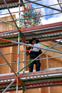 Zimmerermeister Jörg Kittelmann von der gleichnamigen Firma aus Kelheim sprach in luftiger Höhe den Richtspruch, erbat den Segen für das Gebäude und für die darin eine neue Heimat findenden Schüler und Lehrkräfte.