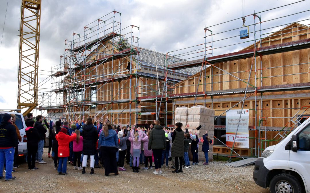Zimmerermeister Jörg Kittelmann von der gleichnamigen Firma aus Kelheim sprach in luftiger Höhe den Richtspruch, erbat den Segen für das Gebäude und für die darin eine neue Heimat findenden Schüler und Lehrkräfte.